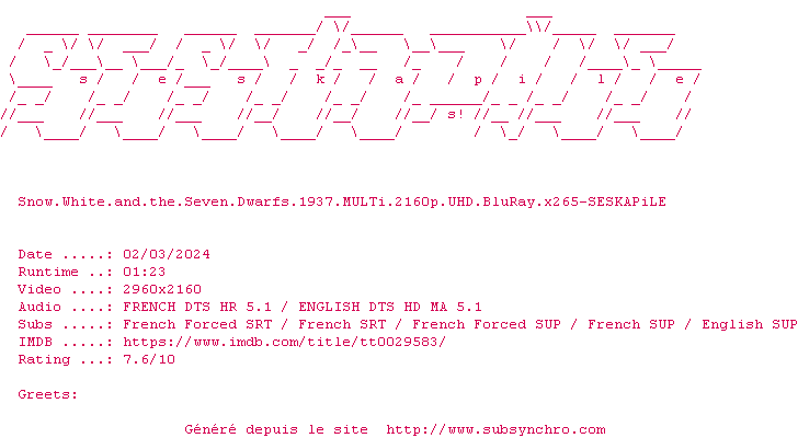 Voir le nfo de la release Snow.White.And.The.Seven.Dwarfs.1937.MULTi.2160p.UHD.BluRay.x265-SESKAPiLE