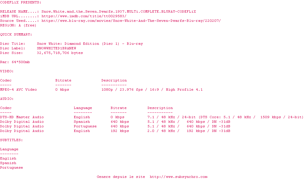 Voir le nfo de la release Snow.White.And.The.Seven.Dwarfs.1937.MULTi.COMPLETE.BLURAY-WDC