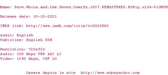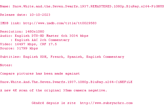 Voir le nfo de la release Snow.White.And.The.Seven.Dwarfs.1937.REMASTERED.1080p.BluRay.x264-PiGNUS