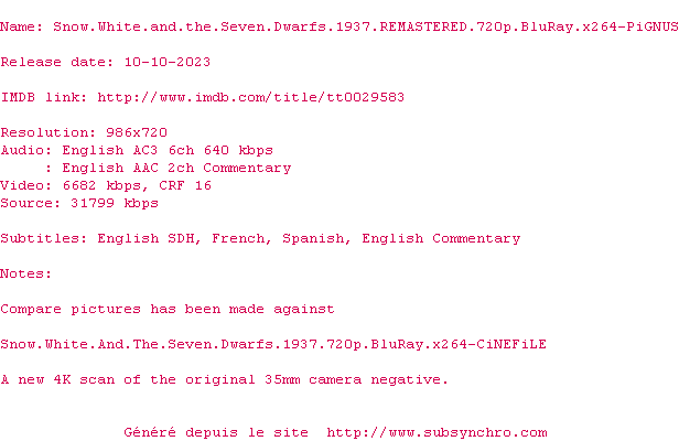 Voir le nfo de la release Snow.White.And.The.Seven.Dwarfs.1937.REMASTERED.720p.BluRay.x264-PiGNUS