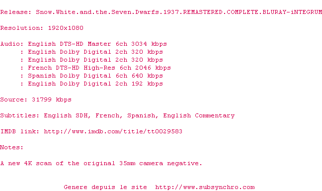 Voir le nfo de la release Snow.White.And.The.Seven.Dwarfs.1937.REMASTERED.COMPLETE.BLURAY-iNTEGRUM