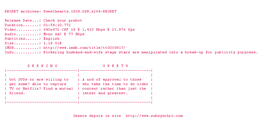 Y avez-vous pense ? Nous proposons déjà 1630 sous-titres pour le film Amants. Avez-vous essaye de voir si ces sous-titres etaient compatibles avec cette release ? On vous laisse le soin de tester cela pour nous et de contribuer au site en postant le sous-titre en cas de compatiblite constatee !