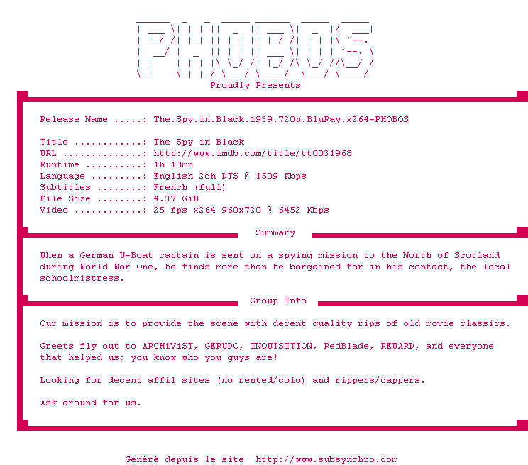 Voir le nfo de la release The.Spy.in.Black.1939.1080p.BluRay.x264-PHOBOS