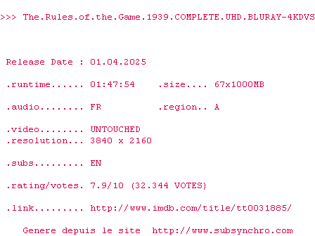 Voir le nfo de la release The.Rules.Of.The.Game.1939.2160p.UHD.BluRay.x265-4KDVS