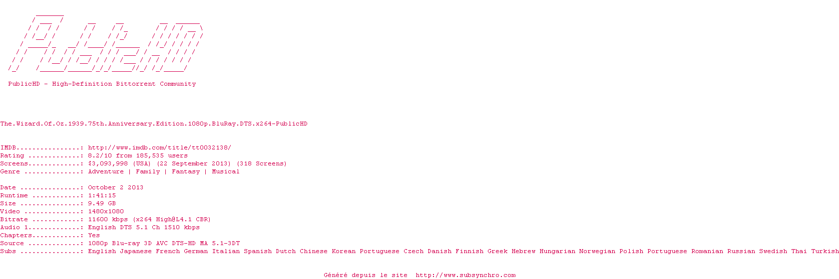 Voir le nfo de la release The.Wizard.Of.Oz.1939.75th.Anniversary.Edition.1080p.BluRay.DTS.x264-PublicHD