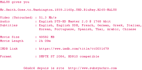 Voir le nfo de la release Mr.Smith.Goes.To.Washington.1939.2160p.UHD.BluRay.H265-MALUS