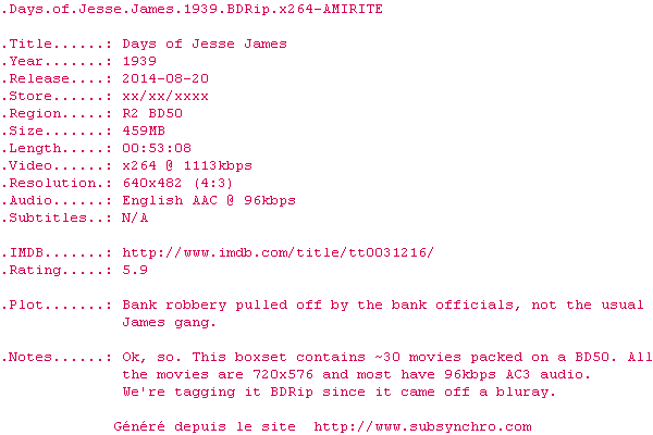 Voir le nfo de la release Days.of.Jesse.James.1939.BDRip.x264-AMIRITE