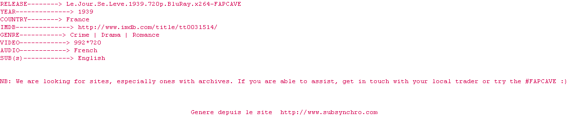 Y avez-vous pense ? Nous proposons déjà 1 sous-titre pour le film Le Jour se lève. Avez-vous essaye de voir si ces sous-titres etaient compatibles avec cette release ? On vous laisse le soin de tester cela pour nous et de contribuer au site en postant le sous-titre en cas de compatiblite constatee !