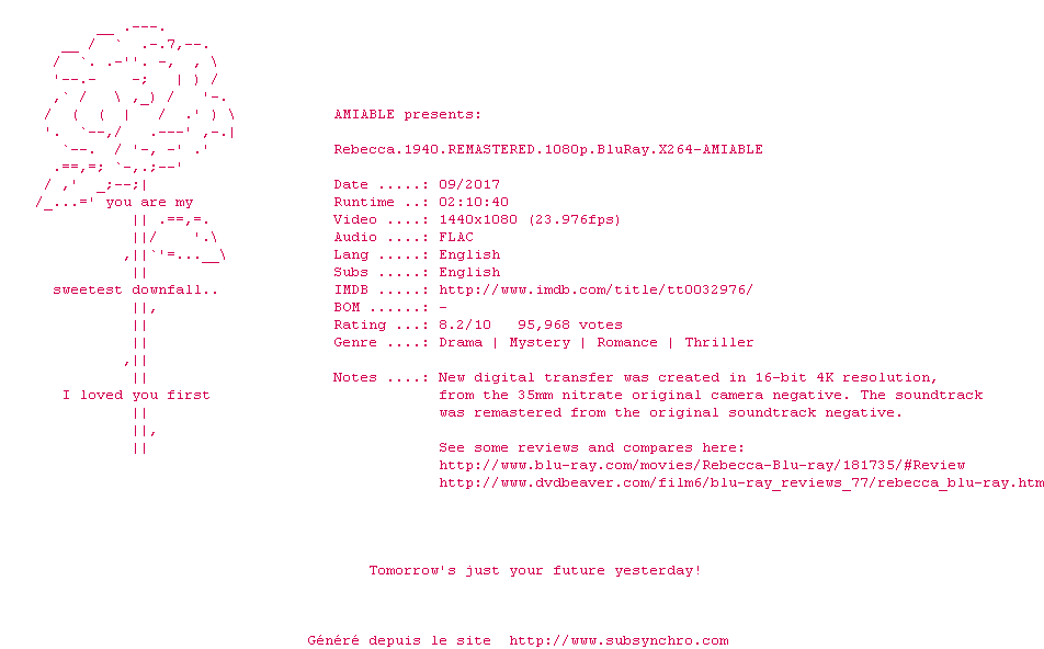Telechargez le RSS « Fichier de la release Rebecca.1940.REMASTERED.1080p.BluRay.x264-AMIABLE »