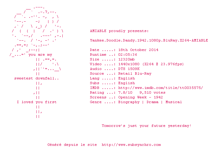 Voir le nfo de la release Yankee.Doodle.Dandy.1942.1080p.BluRay.X264-AMIABLE