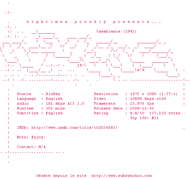 Voir le nfo de la release Casablanca.1942.1080p.BluRay.x264-HiGHTiMES