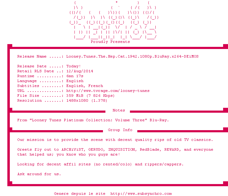 Voir le nfo de la release Looney.Tunes.The.Hep.Cat.1942.1080p.BluRay.x264-DEiMOS