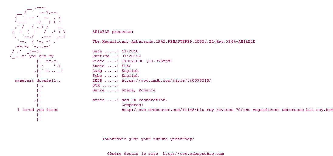 Voir le nfo de la release The.Magnificent.Ambersons.1942.1080p.BluRay.x264-AMIABLE