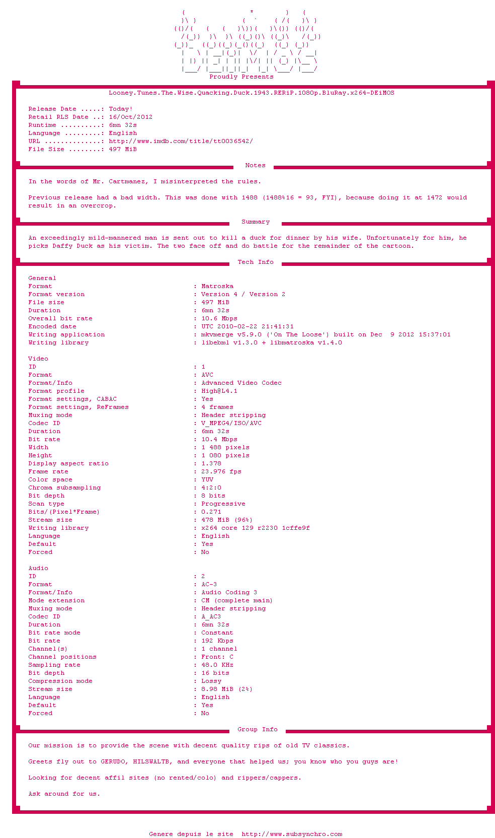Voir le nfo de la release Looney.Tunes.The.Wise.Quacking.Duck.1943.RERiP.1080p.BluRay.x264-DEiMOS