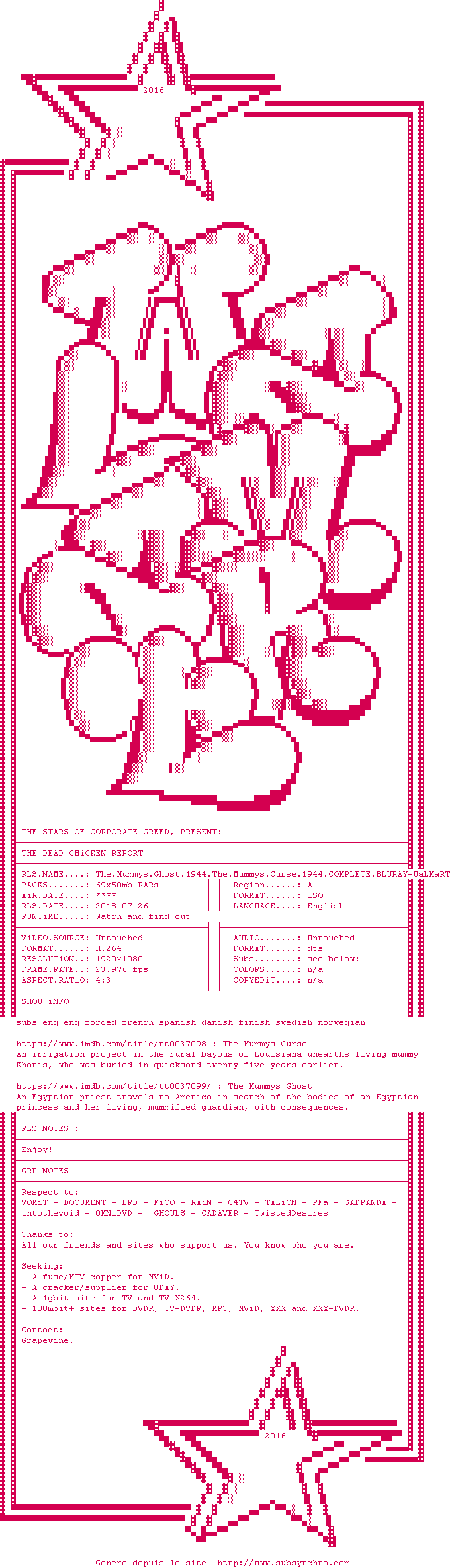 Y avez-vous pense ? Nous proposons déjà 1800 sous-titres pour le film Le fantôme de la momie. Avez-vous essaye de voir si ces sous-titres etaient compatibles avec cette release ? On vous laisse le soin de tester cela pour nous et de contribuer au site en postant le sous-titre en cas de compatiblite constatee !