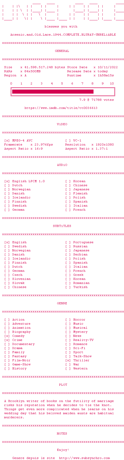 Voir le nfo de la release Arsenic.And.Old.Lace.1944.COMPLETE.BLURAY-UNRELiABLE