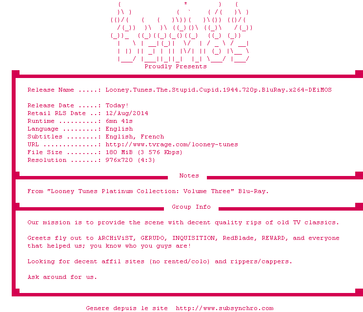 Voir le nfo de la release Looney.Tunes.The.Stupid.Cupid.1944.720p.BluRay.x264-DEiMOS