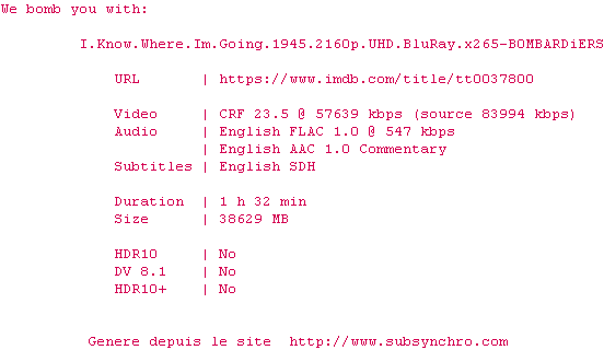Y avez-vous pense ? Nous proposons déjà 1246 sous-titres pour le film Je sais où je vais. Avez-vous essaye de voir si ces sous-titres etaient compatibles avec cette release ? On vous laisse le soin de tester cela pour nous et de contribuer au site en postant le sous-titre en cas de compatiblite constatee !