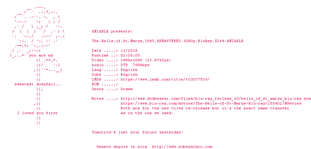 Y avez-vous pense ? Nous proposons déjà 2080 sous-titres pour le film Les Cloches de Sainte-Marie. Avez-vous essaye de voir si ces sous-titres etaient compatibles avec cette release ? On vous laisse le soin de tester cela pour nous et de contribuer au site en postant le sous-titre en cas de compatiblite constatee !