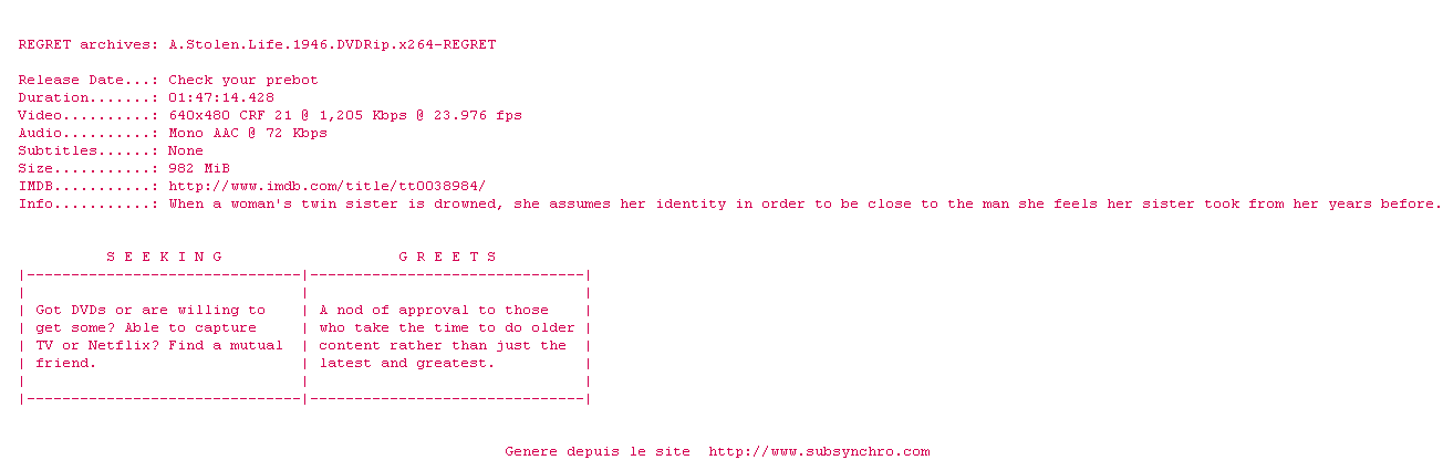 | Voir le nfo de la release A.Stolen.Life.1946.DVDRip.x264-REGRET | REGRET | A.Stolen.Life.1946.DVDRip.x264-REGRET OpenSubtitles | 0 fichier |
