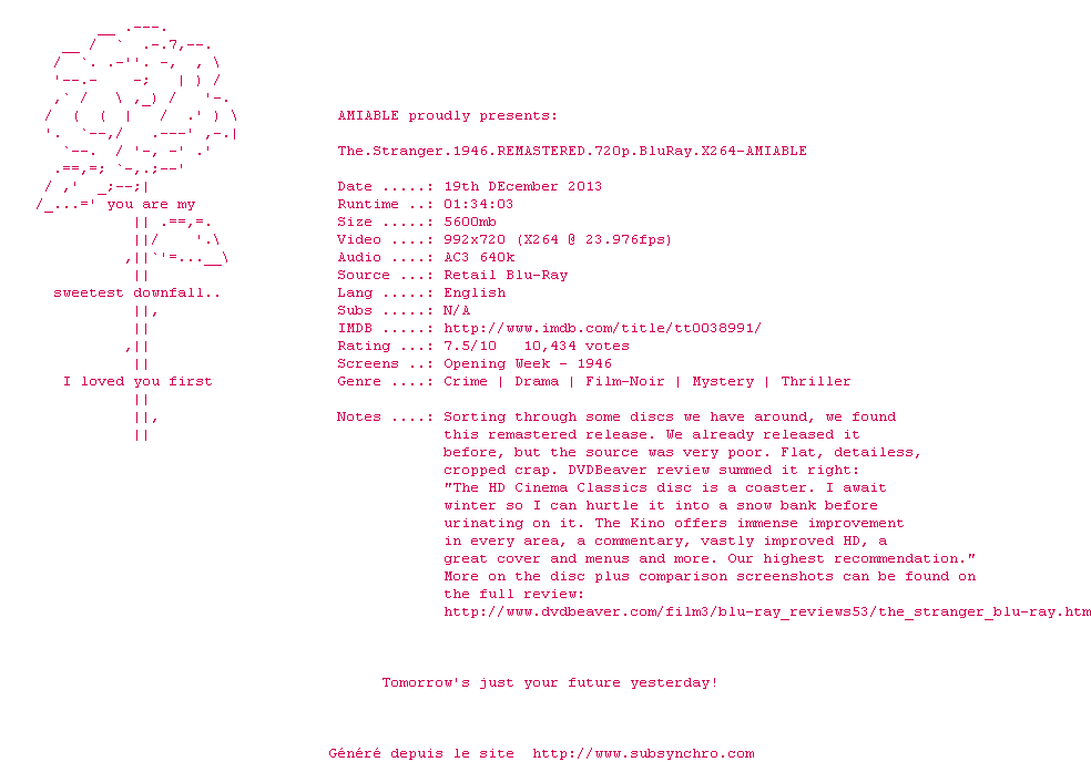 Voir le nfo de la release The.Stranger.1946.REMASTERED.720p.BluRay.X264-AMIABLE