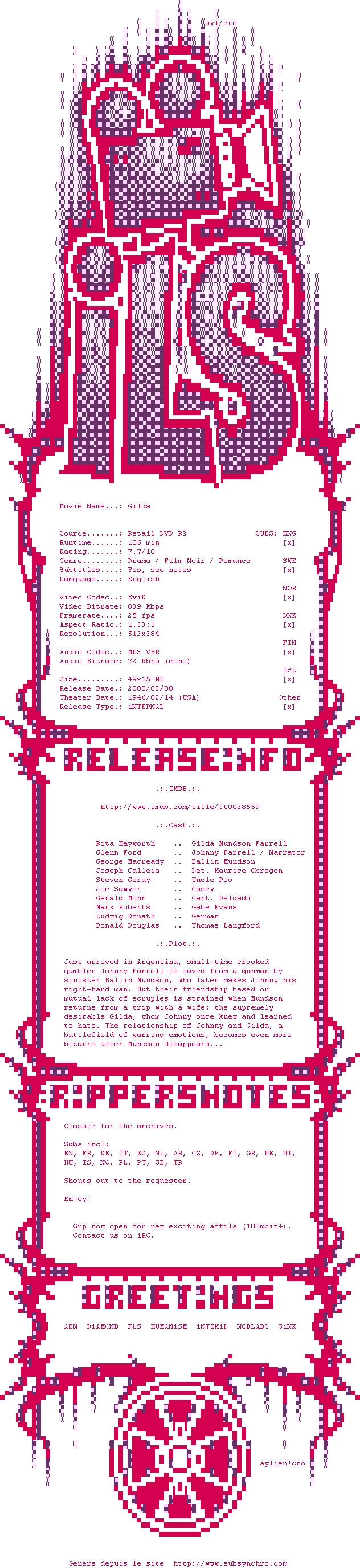 Y avez-vous pense ? Nous proposons déjà 1660 sous-titres pour le film Gilda. Avez-vous essaye de voir si ces sous-titres etaient compatibles avec cette release ? On vous laisse le soin de tester cela pour nous et de contribuer au site en postant le sous-titre en cas de compatiblite constatee !
