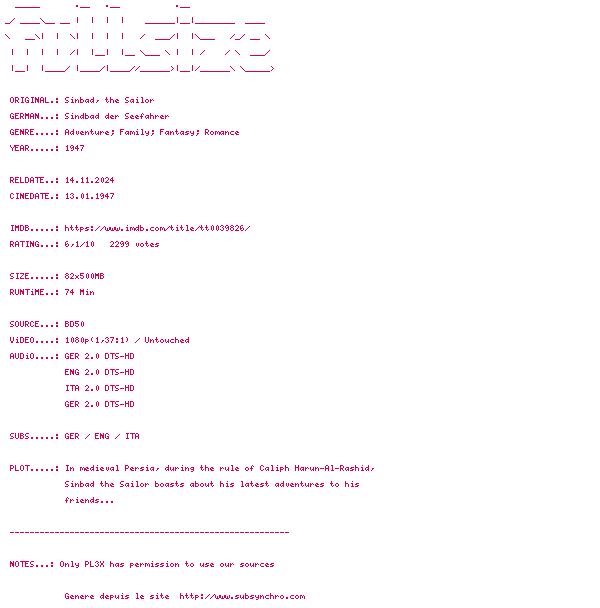 Voir le nfo de la release Sinbad.The.Sailor.1947.MULTI.COMPLETE.BLURAY-FULLSiZE