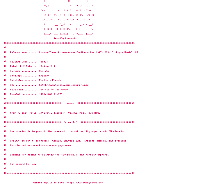 Voir le nfo de la release Looney.Tunes.A.Hare.Grows.In.Manhattan.1947.1080p.BluRay.x264-DEiMOS
