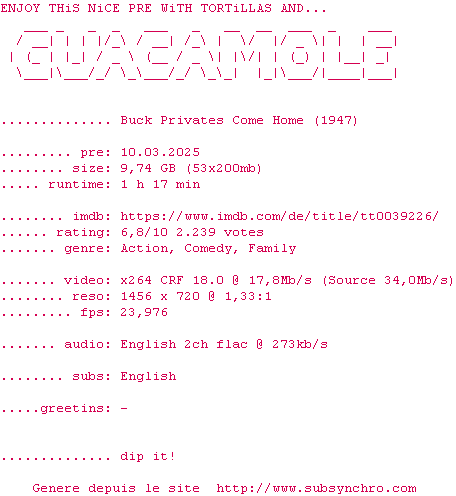 Voir le nfo de la release Buck.Privates.Come.Home.1947.1080p.BluRay.x264-GUACAMOLE