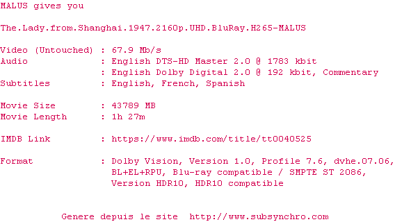 Voir le nfo de la release The.Lady.From.Shanghai.1947.2160p.UHD.BluRay.H265-MALUS