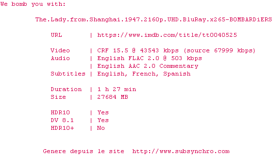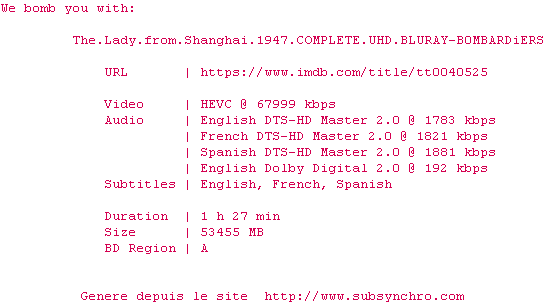 Voir le nfo de la release The.Lady.From.Shanghai.1947.2160p.UHD.BluRay.x265-B0MBARDiERS