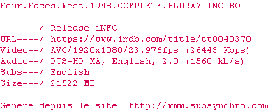 Voir le nfo de la release Four.Faces.West.1948.COMPLETE.BLURAY-INCUBO