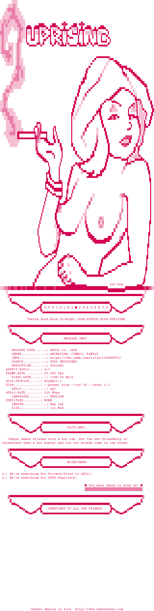 Voir le nfo de la release Theres.Good.Boos.To-Night.1948.DVDRIP.x264-UPRiSiNG