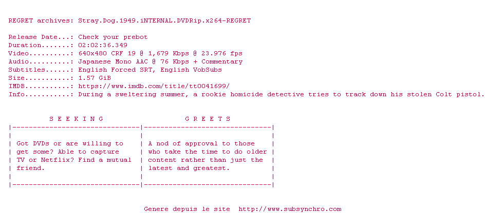 Voir le nfo de la release Stray.Dog.1949.SUBFRENCH.1080p.BluRay.x264-FiDELiO