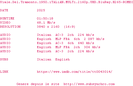 Voir le nfo de la release .Del.Tramonto.1950.ITALiAN.MULTi.2160p.UHD.BluRay.H265-ROMEO