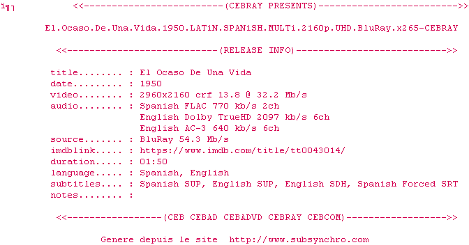 Voir le nfo de la release El.Ocaso.De.Una.Vida.1950.LATiN.SPANiSH.MULTi.2160p.UHD.BluRay.x265-CEBRAY
