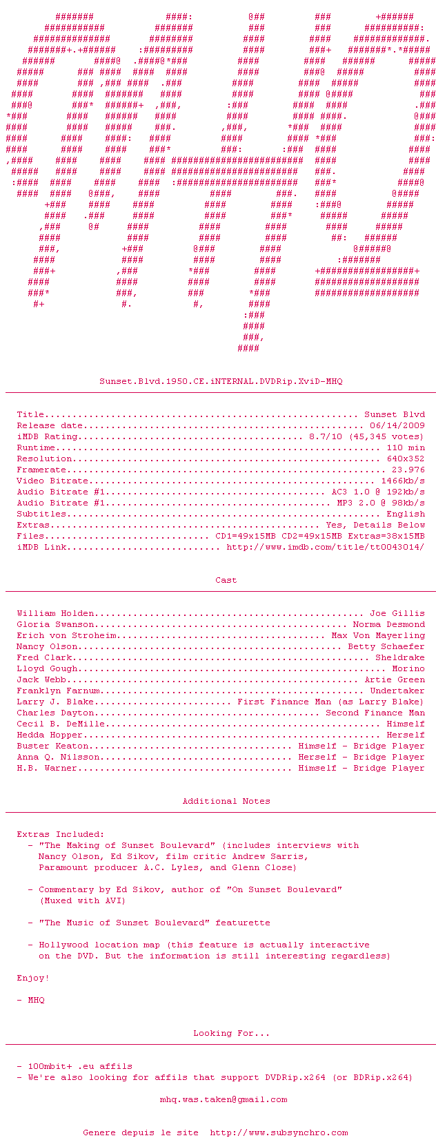 Voir le nfo de la release Sunset.Blvd.1950.CE.iNTERNAL.DVDRip.XviD-MHQ