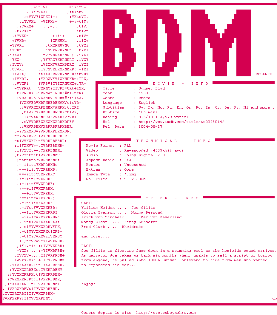 Voir le nfo de la release Sunset.Blvd.1950.PAL.MULTiSUBS.DVDR-BDM