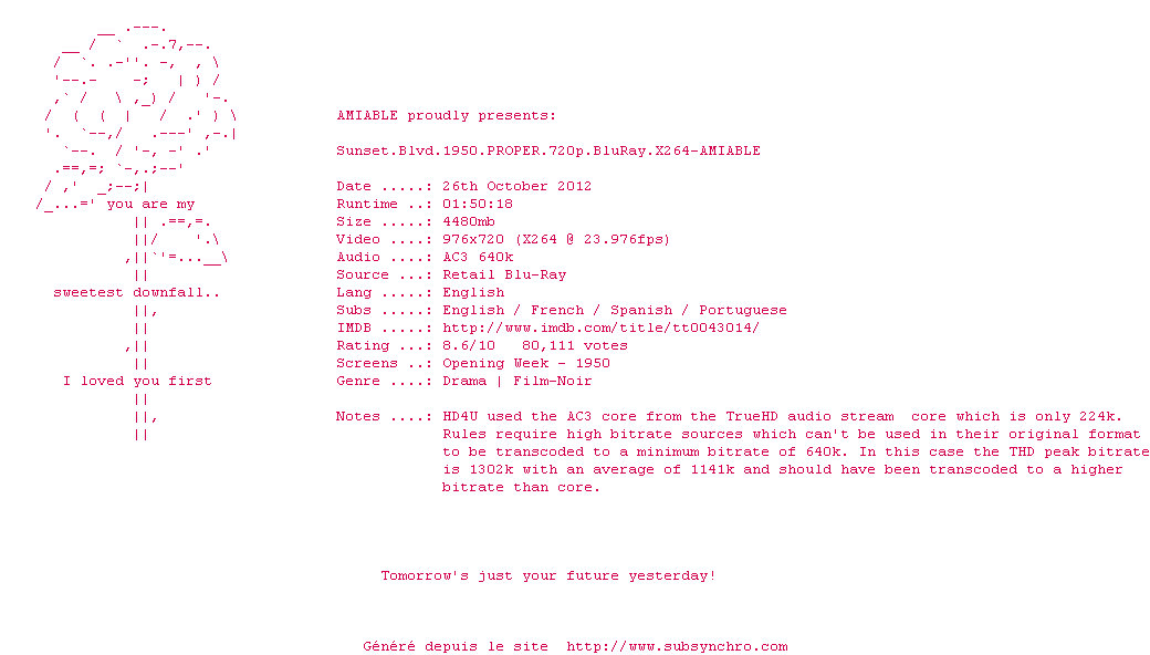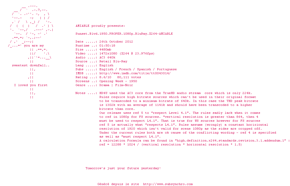 Voir le nfo de la release Sunset.Blvd.1950.PROPER.1080p.BluRay.X264-AMIABLE