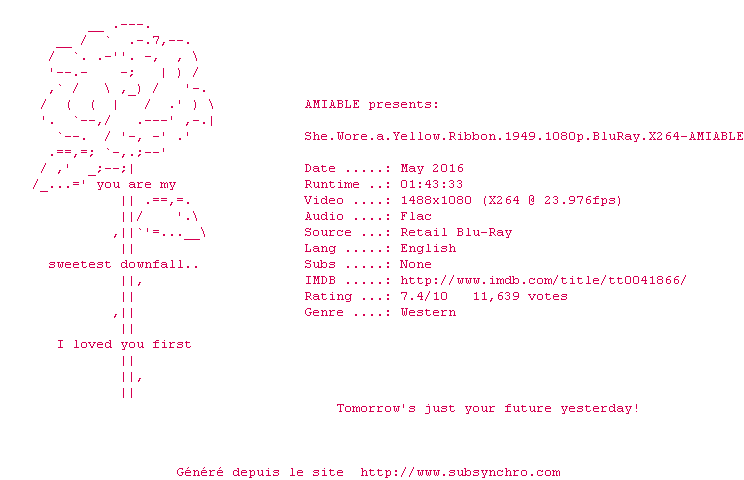 She.Wore.a.Yellow.Ribbon.1949.1080p.BluRay.X264-AMIABLE.French.srt Ajouté par SubSynchro Ajoute le 15-05-2016 20:54:38 Format : SRT Italique : Oui Taille : 0.00Ko Telechargement : 148 Ajouter cette release à ma collection en cas de telechargement des sous-titres 0 0 0 Telecharger le ZiP contenant NFO, Affiche, Sous-titre (*.srt) Commentez le fichier She.Wore.a.Yellow.Ribbon.1949.1080p.BluRay.X264-AMIABLE.French.srt Commentez le fichier She.Wore.a.Yellow.Ribbon.1949.1080p.BluRay.X264-AMIABLE.French.srt Commentez ce fichier Le fichier 1-1463338478.srt n'existe pas ! Telechargez le RSS « Fichier de la release She.Wore.A.Yellow.Ribbon.1949.1080p.BluRay.x264-AMIABLE » Retour a la release « She.Wore.A.Yellow.Ribbon.1949.1080p.BluRay.x264-AMIABLE »