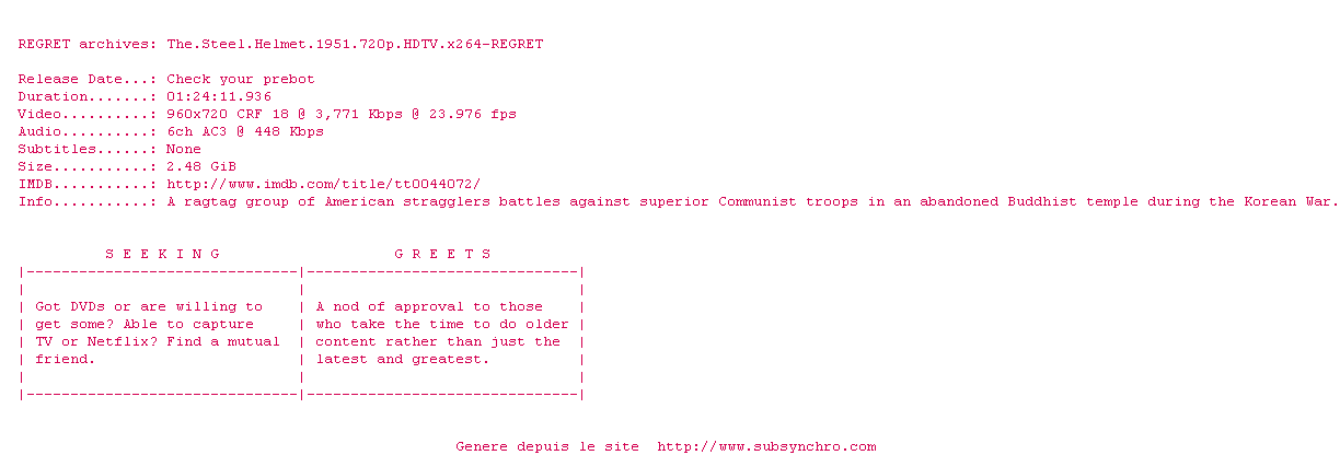 Y avez-vous pense ? Nous proposons déjà 1608 sous-titres pour le film J'ai vécu l'enfer de Corée. Avez-vous essaye de voir si ces sous-titres etaient compatibles avec cette release ? On vous laisse le soin de tester cela pour nous et de contribuer au site en postant le sous-titre en cas de compatiblite constatee !