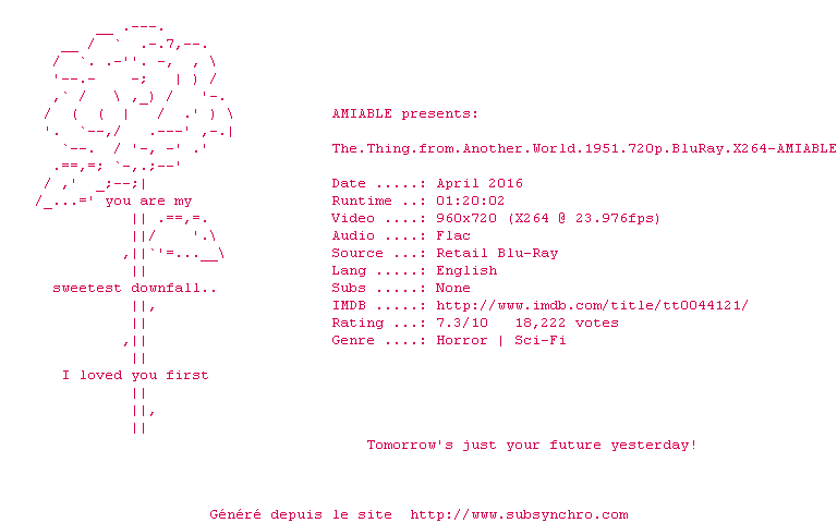 Voir le nfo de la release The.Thing.From.Another.World.1951.1080p.BluRay.x264-AMIABLE