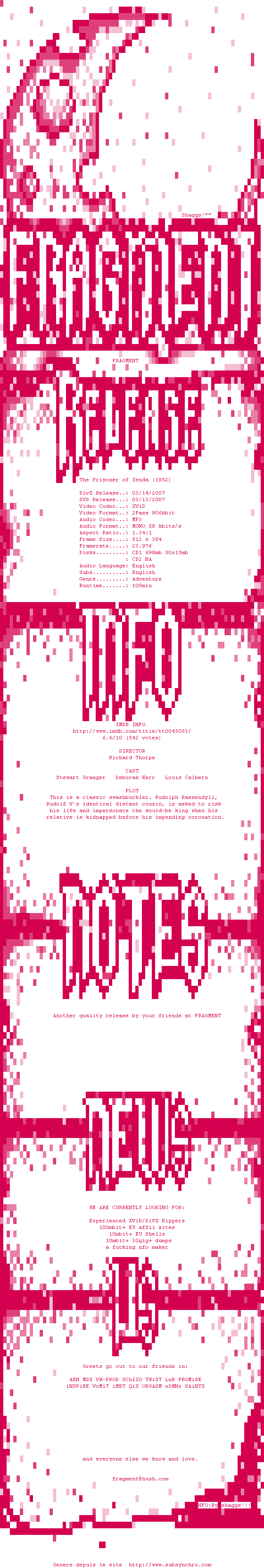 | Voir le nfo de la release The.Prisoner.Of.Zenda.1952.DVDRip.XviD-FRAGMENT | FRAGMENT | The.Prisoner.Of.Zenda.1952.DVDRip.XviD-FRAGMENT OpenSubtitles | 0 fichier |