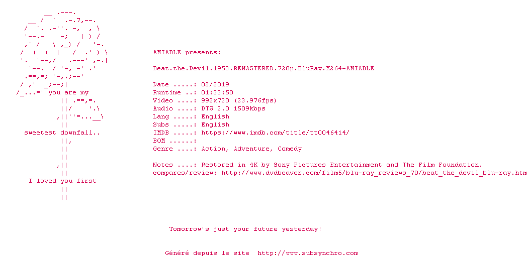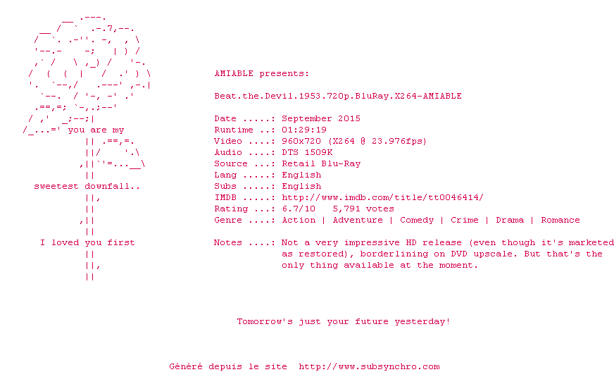 Voir le nfo de la release Beat.The.Devil.1953.REMASTERED.720p.BluRay.x264-AMIABLE