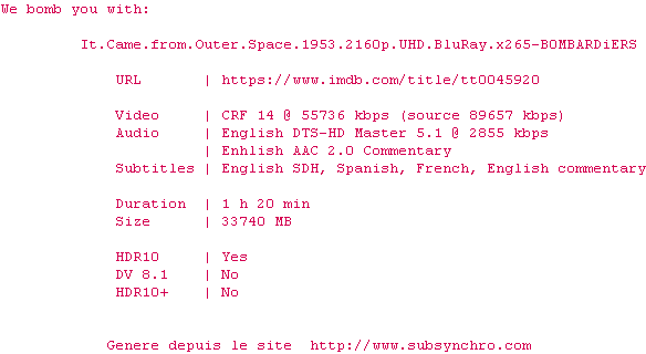 Voir le nfo de la release It.Came.From.Outer.Space.1953.2160p.UHD.BluRay.H265-MALUS