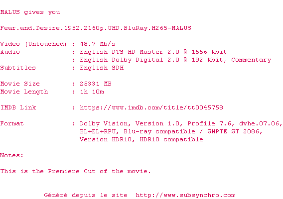 Voir le nfo de la release Fear.And.Desire.1952.2160p.UHD.BluRay.H265-MALUS