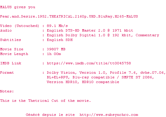 Voir le nfo de la release Fear.And.Desire.1952.THEATRICAL.2160p.UHD.BluRay.H265-MALUS