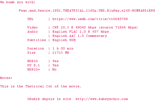 Voir le nfo de la release Fear.And.Desire.1952.THEATRICAL.2160p.UHD.BluRay.x265-B0MBARDiERS