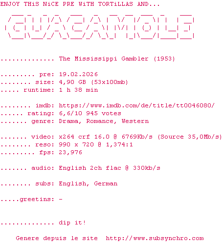 Telechargez le RSS « Fichier de la release The.Mississippi.Gambler.1953.720p.BluRay.x264-GUACAMOLE »