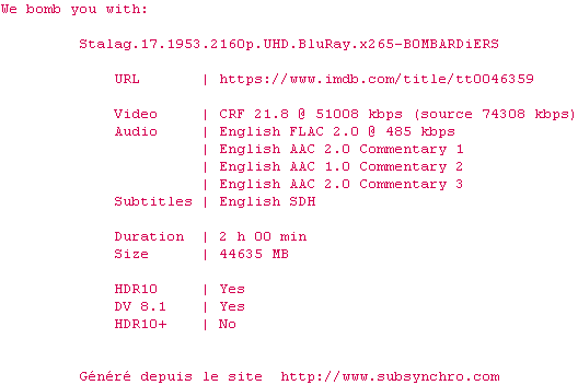 Voir le nfo de la release Stalag.17.1953.2160p.UHD.BluRay.x265-B0MBARDiERS